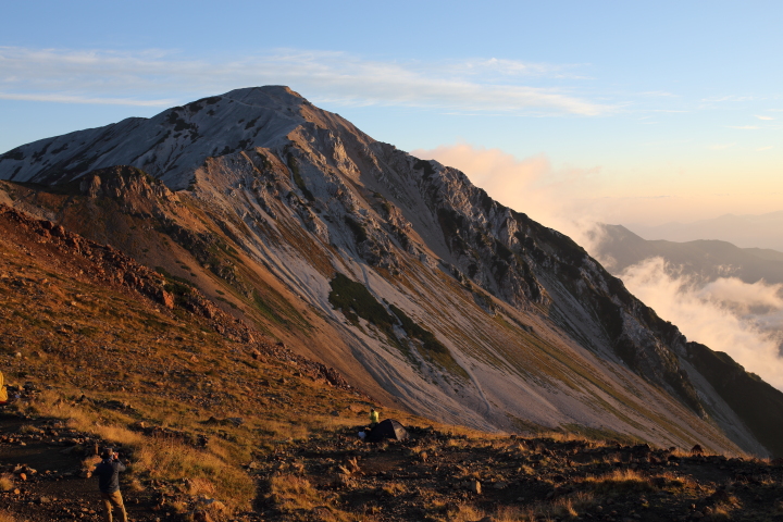 この三山は長野側が切れ落ちてて富山側はなだらかなお花畑の様相。盛夏には花が咲き乱れて綺麗な花畑になるんだろうなと思いました。