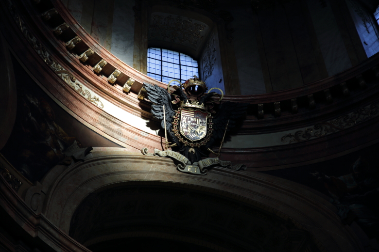 誰もいない夕暮れの薄暗い中の生きた教会で、後ろにはモーツァルトが演奏したパイプオルガンがひっそりとありました。