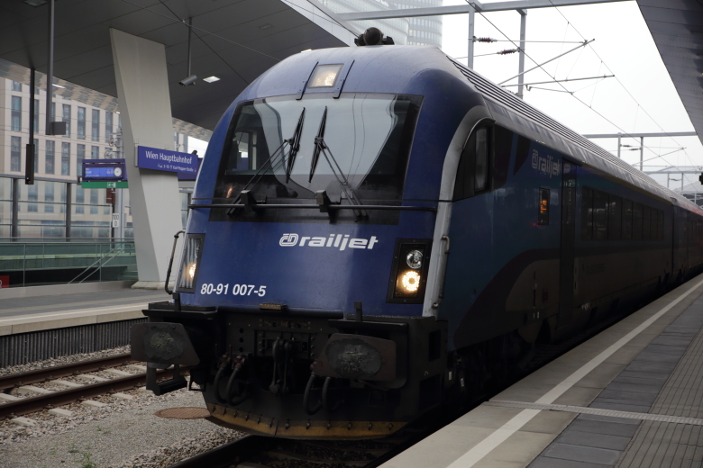 ウィーン国際空港に着いたら、オーストリア連邦鉄道の切符カウンターで2日分のフリーチケットと、中央駅まで行きたいという旨を伝えて、2種類の切符を手に入れ、早速お目当てのrailjetに一駅分ですが乗れました。